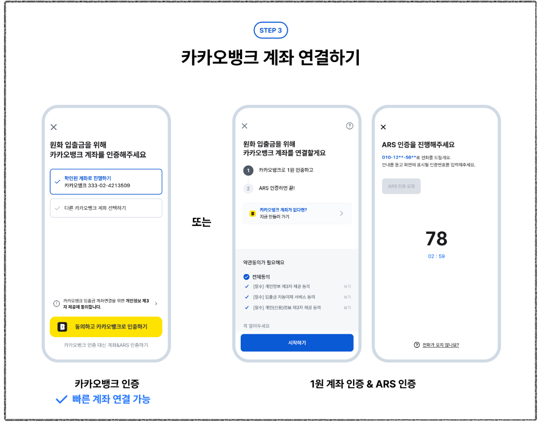 - 카카오뱅크가 아닌 다른 은행 계좌를 연결하려면 ‘계좌 & ARS 인증’을 진행해야 합니다.