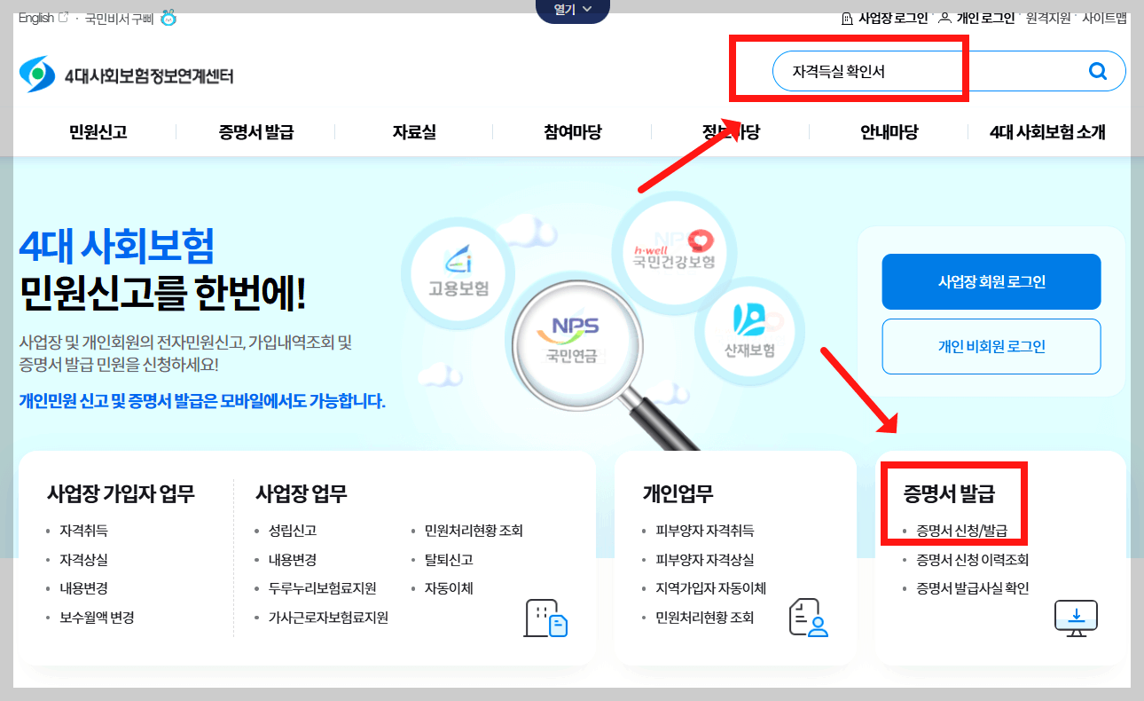 기능 4대보험 자격 확인, 가입내역 통합조회, 가입확인서 발급 등